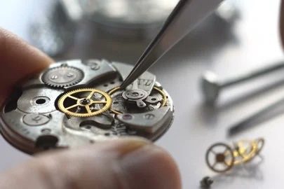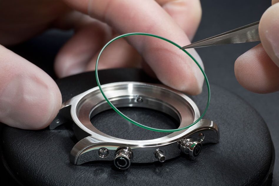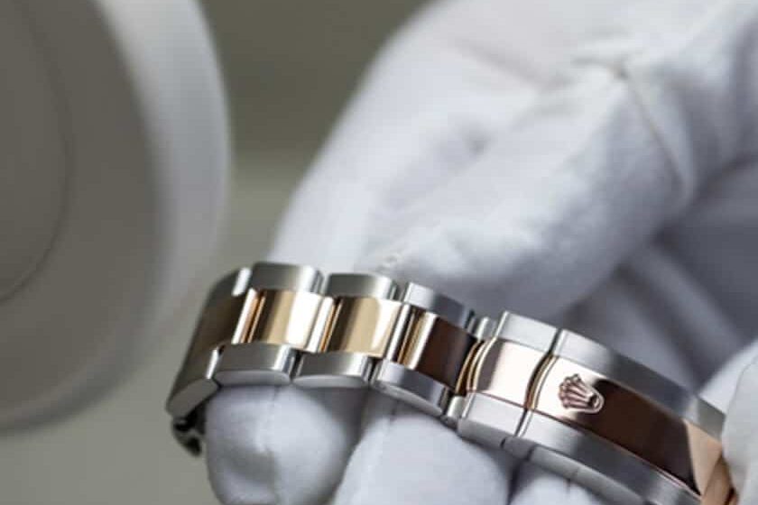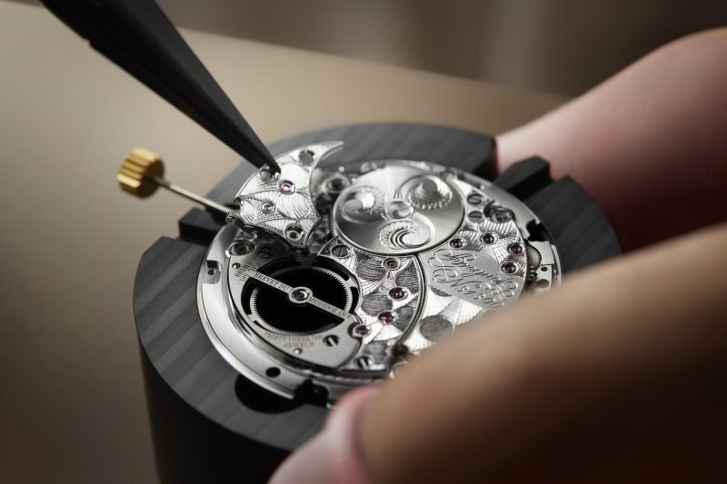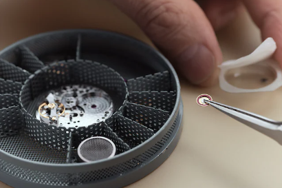 The movement, still fitted with its dial and hands, is removed from the case – from which the bracelet has already been detached. The movement, case and bracelet will follow separate paths during servicing before being reassembled at the end of the process.